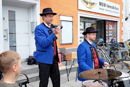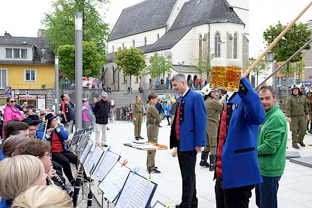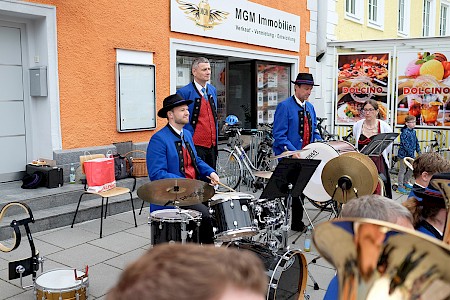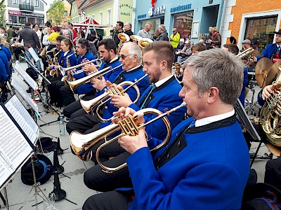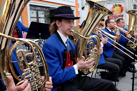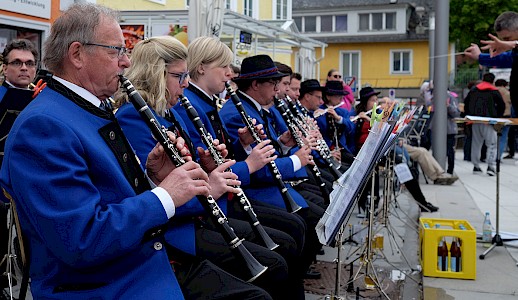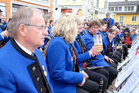 Die Stadtkapelle begleitet den Maibaum auf den Marktplatz und sorgt für die musikalische Umrahmung des Aufstellens.